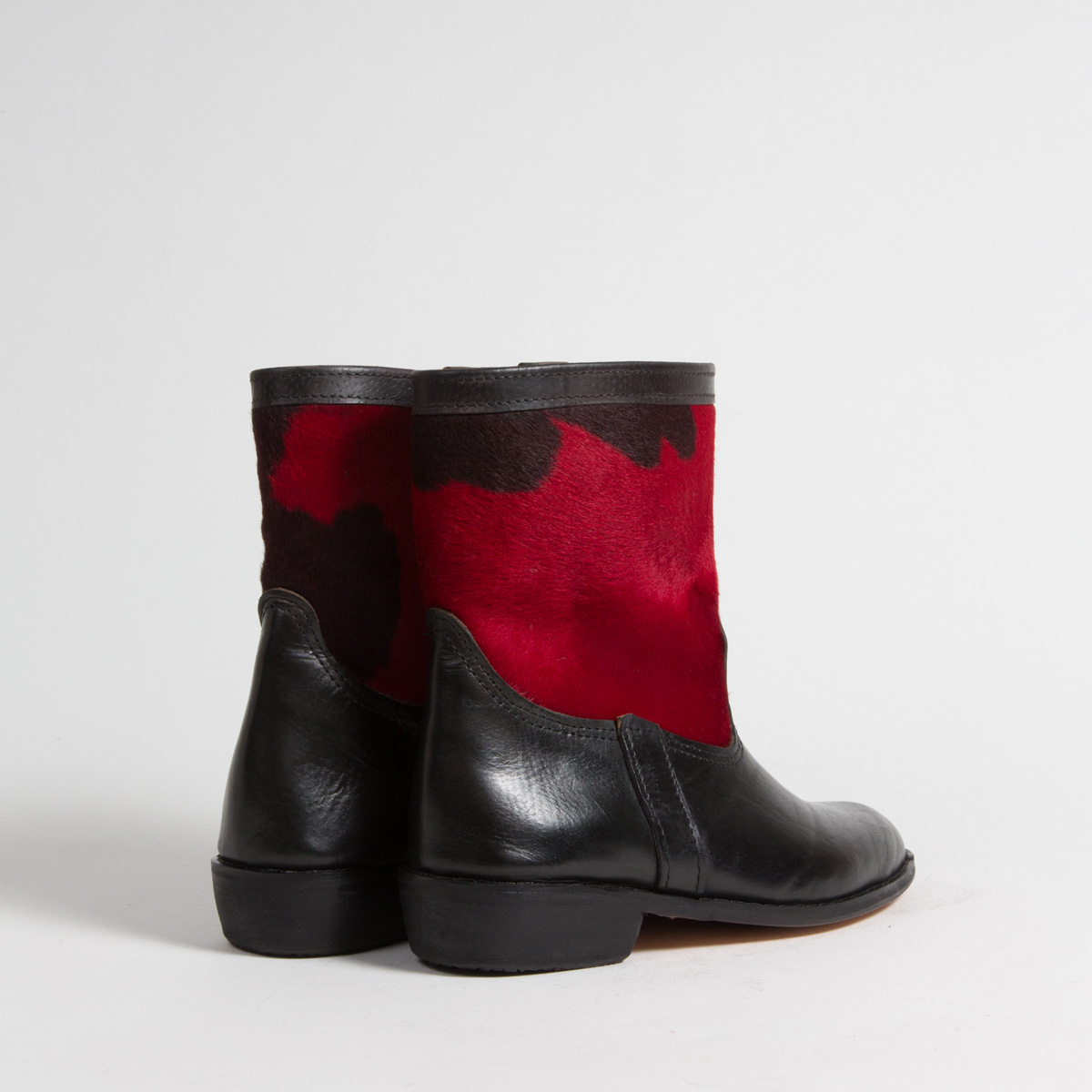 En rouge et noir, les bottines Cerise tout cuir, évoquant une coulée d'encre noire sur un buvard, sont à la fois chics et cool. Avec leur tige velours en cuir de veau poilu et son cuir noir satiné, ces bottines donneront un look très original à vos pieds.