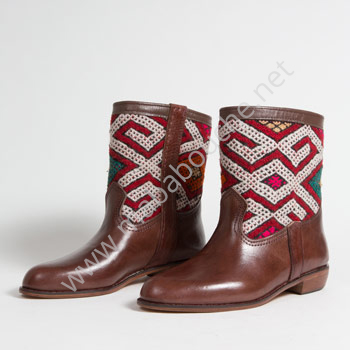 La tige des bottines est faite avec un authentique tapis kilim tissé par les femmes berbères dans leur village, le reste est tout cuir de veau naturel.